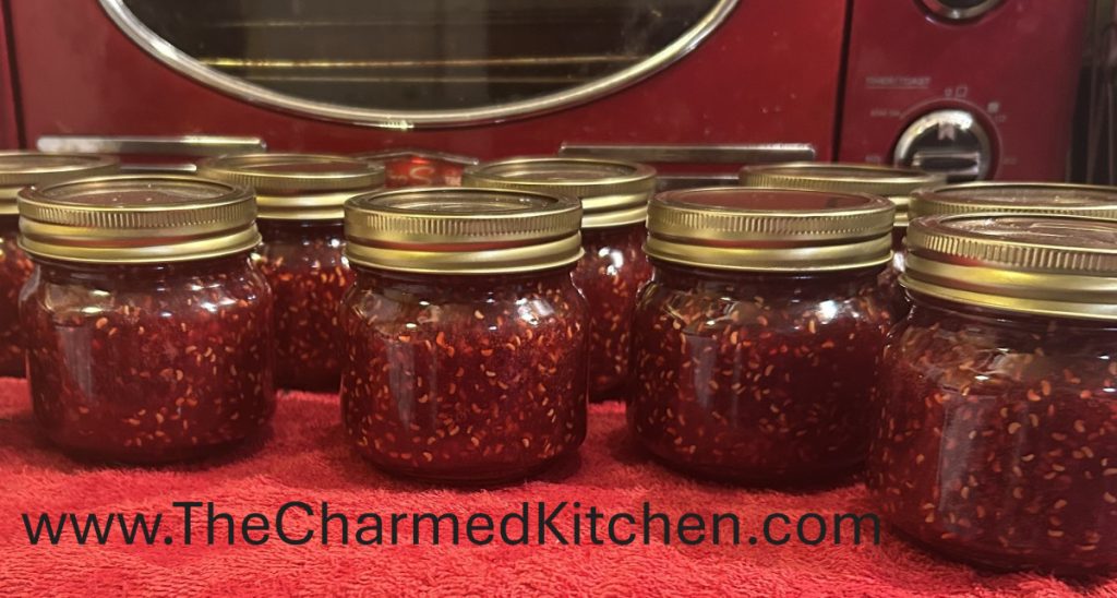 Fill water bath canner with enough water to cover jars by at least an inch. Start heating up the water. Wash 8-9 jelly jars and set aside. Prep the lids and set aside. Rinse and crush berries. Crush enough berries to yield 5 cups. Place berries in a large pot and add the lemon juice and pectin. Bring to a rapid boil over medium high heat. Stir to keep the mixture from sticking or burning. Once the mixture comes to a full rolling boil, boil 1 minute longer. Add the sugar and continue stirring until mixture reaches a full, rolling boil. Boil 1 minute, then remove from the heat. Skim off any foam. Sometimes with raspberries, there is a lot of foam. Don’t’ worry, just try to get it all out. I use a metal slotted spoon. Ladle hot jam into jars, leaving ½-¼ inch headspace. Wipe rims of the jars with a clean damp cloth or paper towel. Screw on lids until fingertip tight. Place jars in the water bath canner and start timing when water returns to the boil. Process 10 minutes. Turn off heat and let jars stay in the canner for 5 minutes before removing the jars from the canner. Place jars on a cooling rack of towel on the counter, away from drafts. Once jam has cooled down, check that they have all sealed. Yield 8-9 jars.    Note: Sometimes with raspberries there is so much foam to remove. In my most recent batch there was over a cup of foam. I saved it and put it in the fridge. I used it on toast and it tasted great. You can reduce the amount of foam by adding ½ teaspoon of butter when you start cooking the berries. I didn’t use it in case I wanted to share the jam with anyone who doesn’t consume dairy.