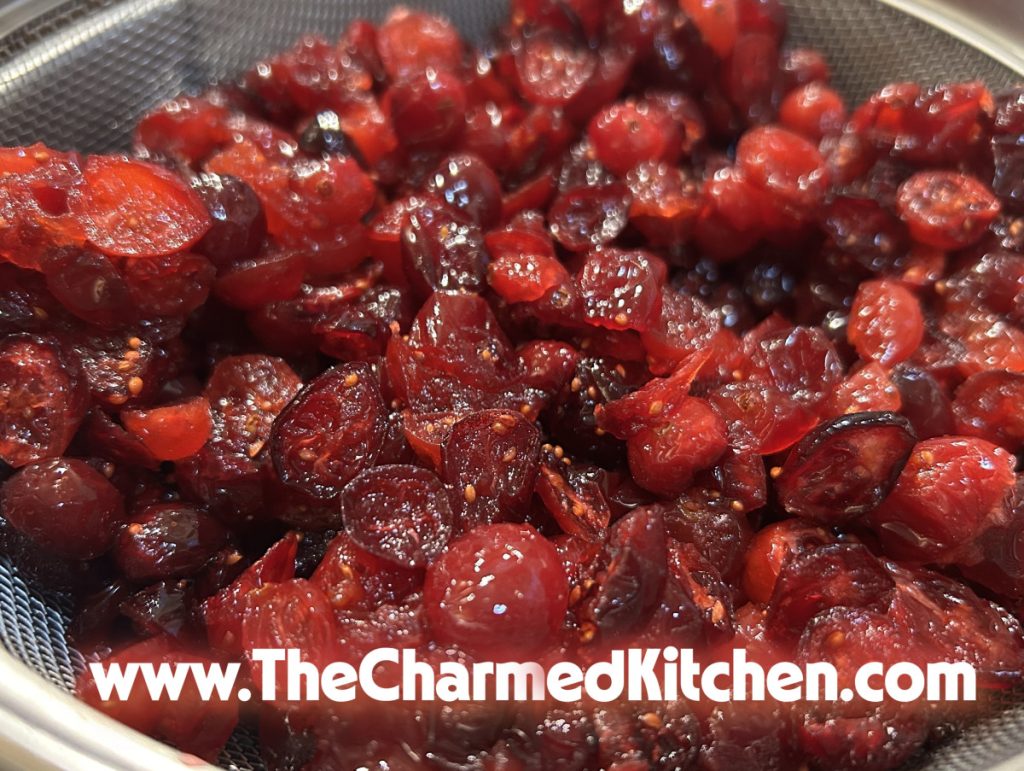 Rinse the cranberries and cut them in half, discarding any bad berries. This is kind of tedious, but you really don’t want to skip this step. Definitely try to buy larger berries, if you can. Fewer of them to slice that way. Once the berries are cut in half, place in a food dehydrator. Set around 150 degrees F and dry for 4-6 hours. You want them partially dried. Now you are going to rehydrate them in a honey syrup. In a saucepan, combine the water and honey. Add a pinch of salt, if you like. Add the cranberries. Bring the mixture to a simmer. Simmer 3 minutes, then turn the heat off. Let the berries steep another 15 minutes. You’ll need to drain the berries well, before returning them to the dehydrator. Save any syrup that you drain off. It tastes great and can be used for cocktails and “mocktails”. Store syrup in the fridge. Another important thing. Don’t place these honey soaked cranberries right on the dehydrator racks. It will make a mess. Cut out parchment paper to line the trays and place the berries on that. You’ll thank me later. Try to separate them as much as possible. You don’t want a solid blob of dried cranberries. Return to the dehydrator at around 150 degrees again for 6-8 hours. When done, the berries will be soft and pliable, but not sticky. They can be stored at room temp, refrigerated of even stored in the freezer. Your choice. Some of mine were still a bit sticky, so I put them in small containers and froze them.