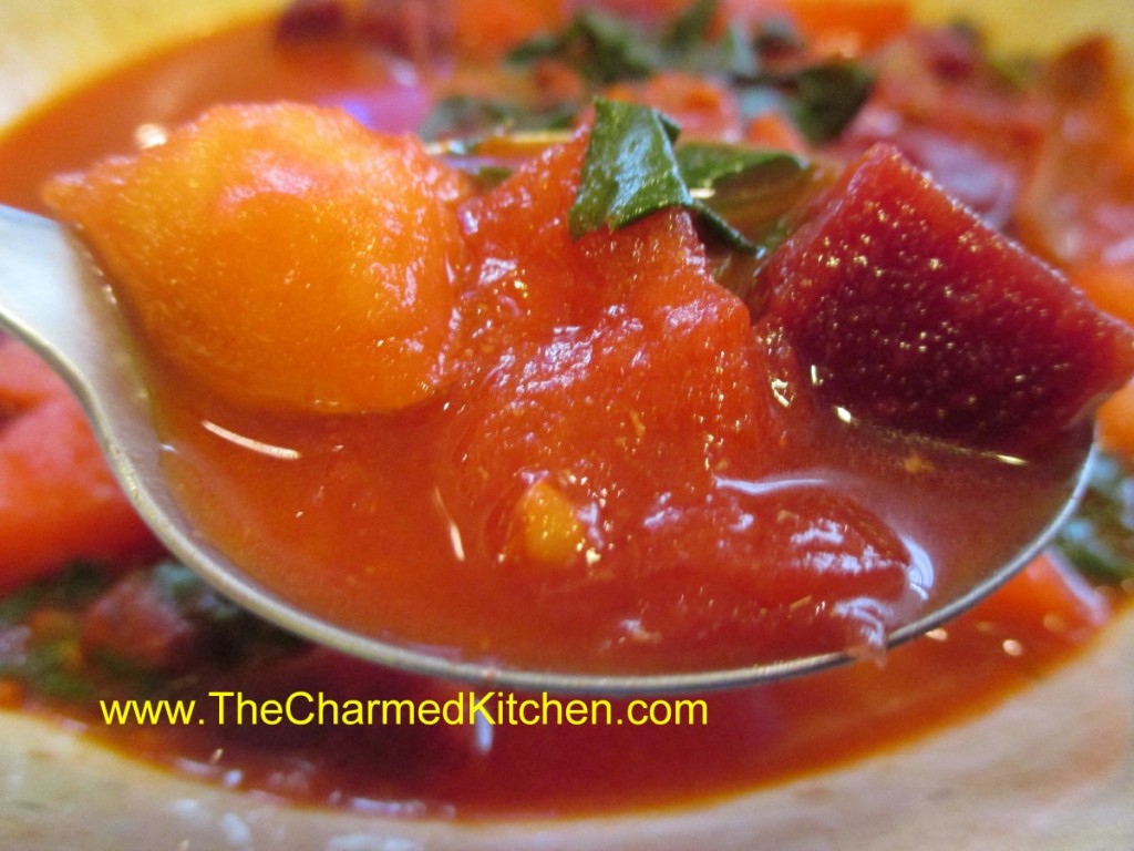 Note: You can also pre-cook the beets or use canned beets. Trim off leaves of beets, leaving 2 inches of stem. Leave roots intact. Boil beets in water until tender, which can take as little as 20 minutes for tiny beets or 45 minutes for the large ones. Cool in bowl of ice water and then slip off the skins. Dice and add to soup as if the beets were canned. You don’t need the long cook of fresh beets. Just bring soup up to a simmer.